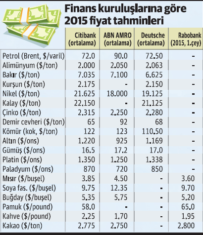 Deutsche Bank da, 2015 yılında emtiada getirinin çok sınırlı olacağını düşünüyor. “2015’te emtianın hemen her segmentinde sancılı bir seyir olabilir” diyen Deutsche Bank Almanya Baş Ekonomisti Stephan Schneider, fiyatların daha da düşmesini beklediklerini ifade etti. Özellikle güçlü dolar nedeniyle 2014’te fiyatı sert bir şekilde gerileyen altında düşüşün süreceğini ifade ediyor kuruluş. Altının yeni yılda yükselmesinin olası görmeyen Schneider, altının cazibesinin daha da azalacağı yorumu yaparak ortalama ons fiyatını 1.150 dolar olarak tahmin ediyor.