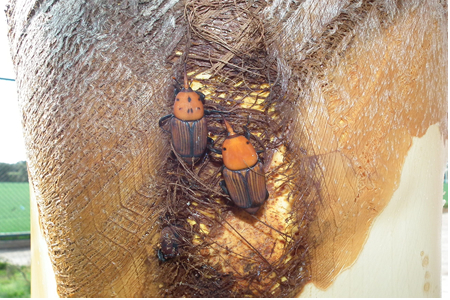 Bölgede etkili olan kırmızı palmiye böceğine karşı ciddi önlemler alınması gerektiğini kaydeden Barış, zararlının palmiye ağaçların ana gövdelerin taç aksamından girerek çok sayıda yumurta bırakan, önce larva olarak zarar vermeye başladığı ve kısa zamanda liflerden koza örerek zararını sürdürerek palmiye ağacını çökerttiğini belirtti.