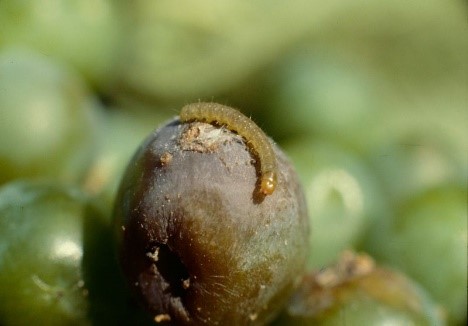 Larvaları tomurcuk, çiçek koruk ve olgun daneleri yemek suretiyle zararlı olurlar. Larva tomurcuk ve çiçek içinde beslenirken salgıladığı ipliklerle tomurcuk ve çiçekleri birbirine bağlayarak salkımları küme haline getirir.