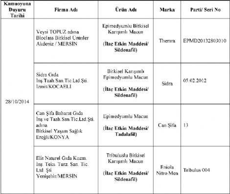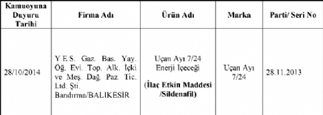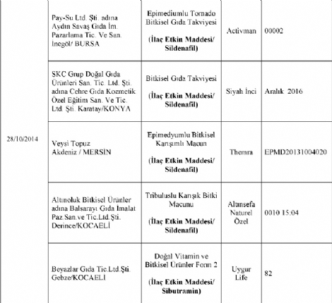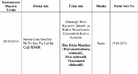 Sağlığı tehlikeye düşürecek şekilde bozulmuş, değiştirilmiş ürünlerle ilgili laboratuvar analizleri neticesinde ilaç etken maddesi içerdiği tespit edilen 11 parti ürün için ise (takviye edici gıda, kahve ve enerji içeceği) masrafları sorumlusuna ait olmak üzere piyasadan toplatılmasına ve ürünlerin mülkiyetinin kamuya geçirilmesine karar verildi.
