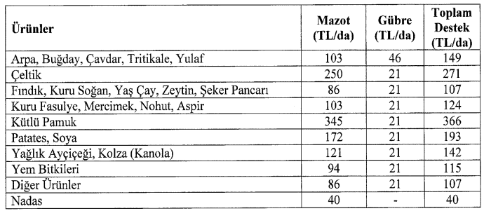 Fındık, Kuru Soğan, Yaş Çay, Zeytin, Şeker Pancarı Üreticileri: Dekar başına 86 lira mazot, 21 lira gübre olmak üzere toplamda 107 lira destek alacaklar.