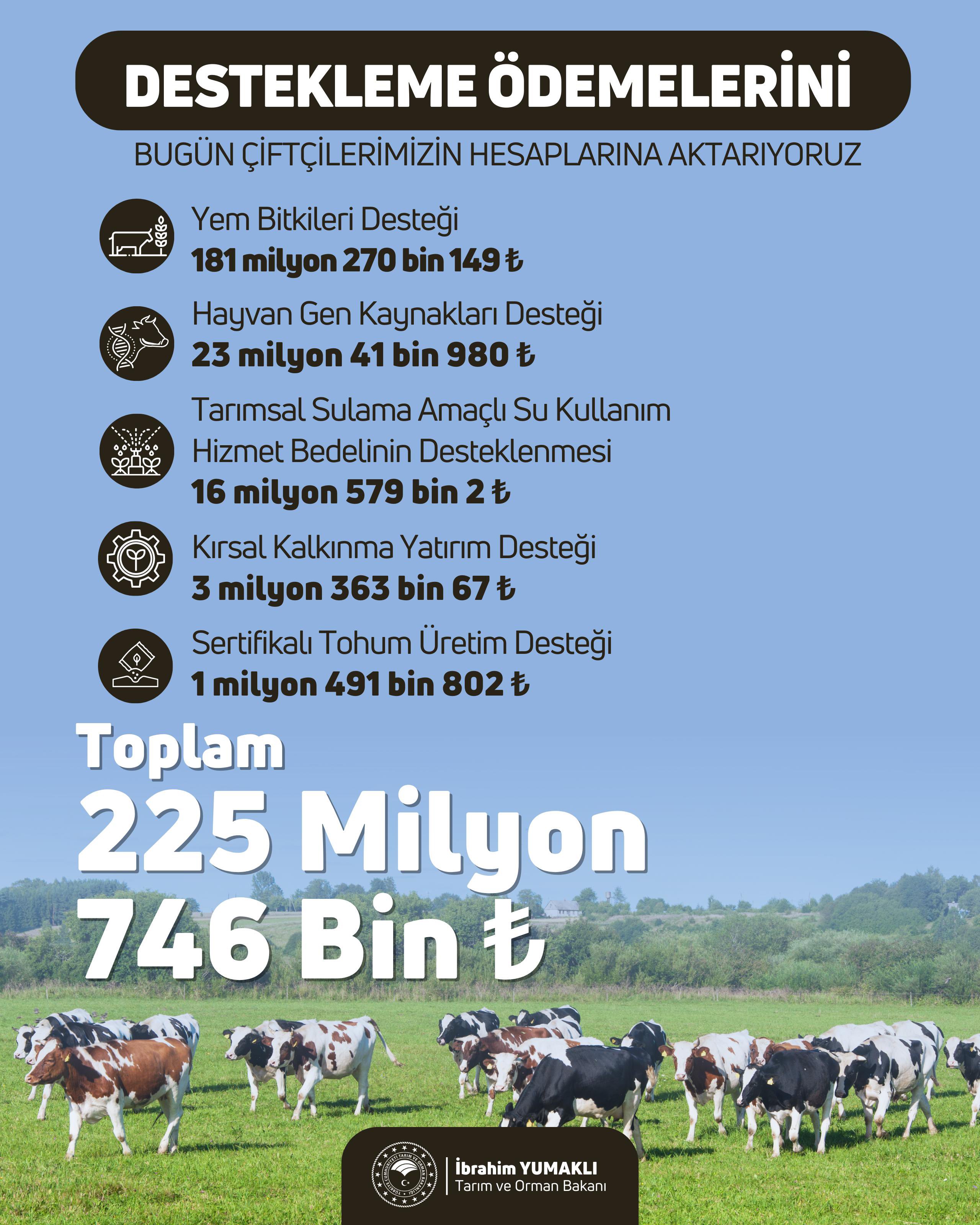 Toplamda, 5 farklı kalemde 225 milyon 746 bin TL ödeme çiftçilerin hesaplarına yatırılmıştır.