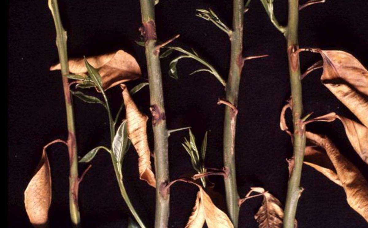 - Genç sürgünlerin yaprak sapı siyahlaşır, yaprak yüzeyinde ıslağımsı esmer lekeler oluşur, yaprak turgorunu kaybeder ve orta damar boyunca kıvrılarak aşağı doğru sarkar. Hastalık, genç sürgünlerde soğuktan yanmış gibi zarar yapar. Sürgünler kısa zamanda çıplaklaşır ve kurur.