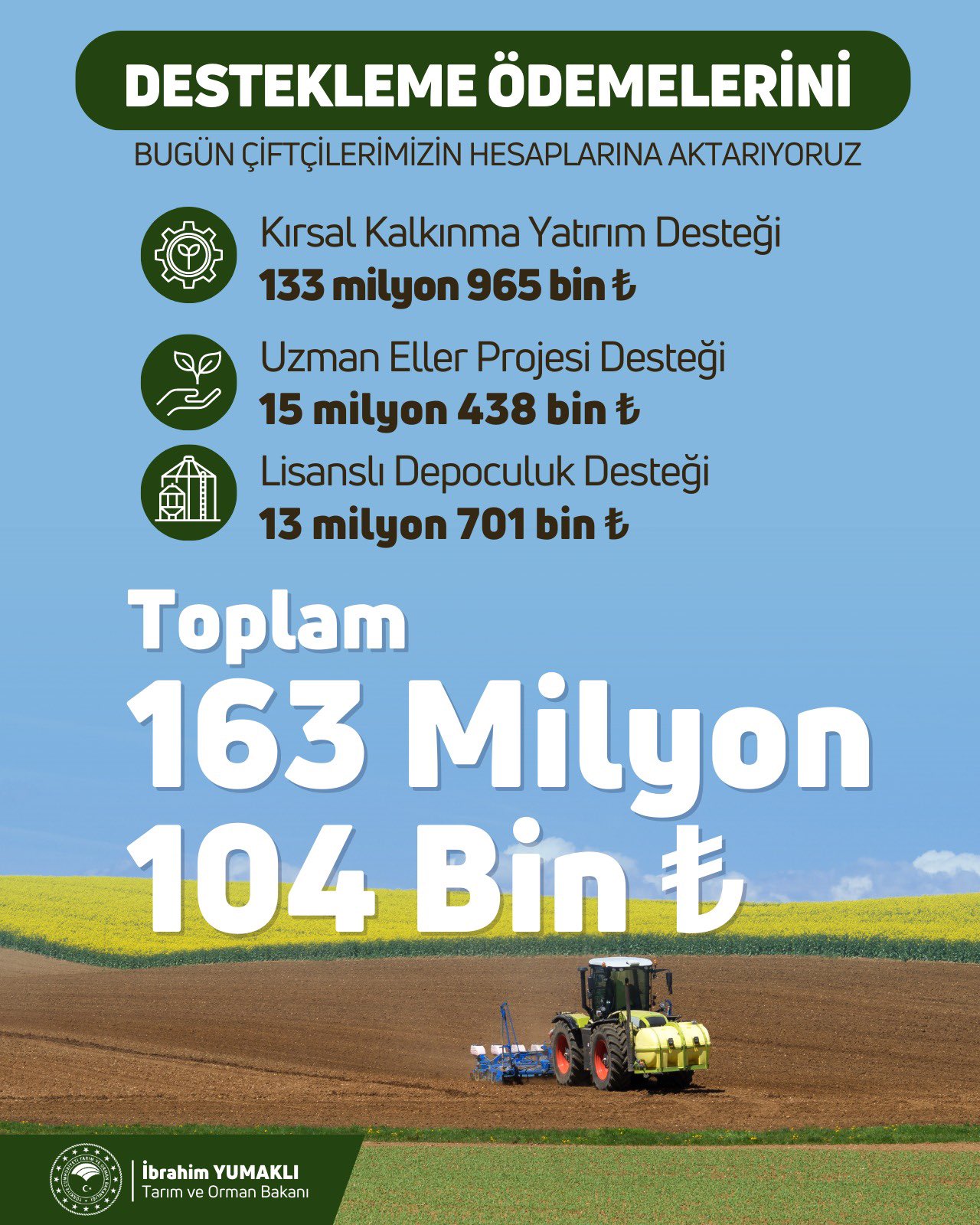 Yumaklı, "Kırsal Kalkınma Yatırım Desteği kapsamında 133 milyon 965 bin TL, Uzman Eller Projesi Desteği kapsamında 15 milyon 438 bin TL, Lisanslı Depoculuk Desteği kapsamında 13 milyon 701 bin TL, olmak üzere toplam 163 milyon 104 bin TL tarımsal destekleme ödemesini çiftçilerimizin hesaplarına bugün aktarıyoruz. Hayırlı ve bereketli olsun" ifadelerini kullandı.