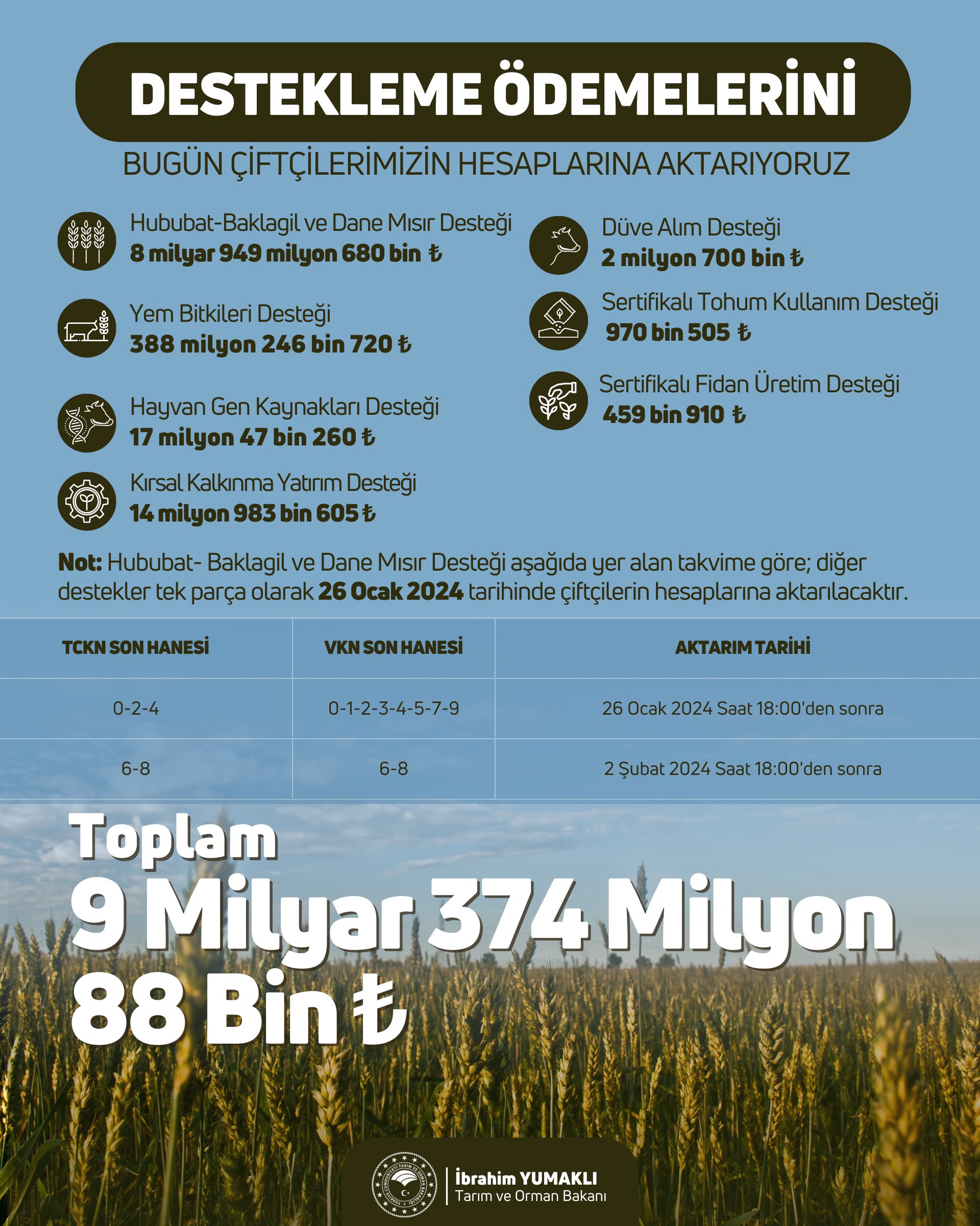 Tarım ve Orman Bakanlığı, çiftçilere yönelik tarımsal destek ödemelerini bugün hesaplarına aktarmaya başlıyor. Toplamda 9 milyar 374 milyon 88 bin TL'lik destekleme ödemesi çeşitli kategorilerde dağıtılacak.