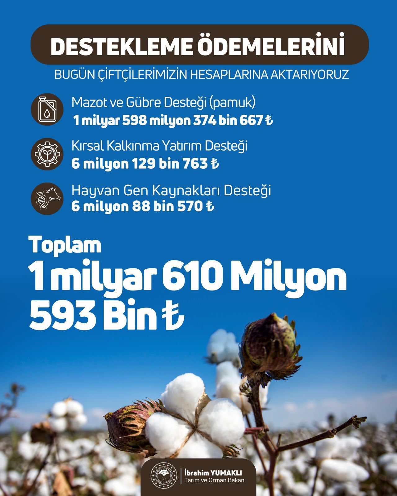 toplamda 3 kalemde 1 milyar 610 milyon 593 bin TL ödeme bugün çiftçilerimizin hesaplarına aktarıldı.