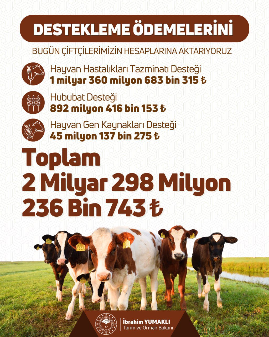 "Üreticimizin emeğine destek, üretime güç olmaya devam ettik. 2 milyar 298 milyon 236 bin TL destekleme ödemesini çiftçilerimizin hesaplarına aktardık. Hayırlı ve bereketli olsun."