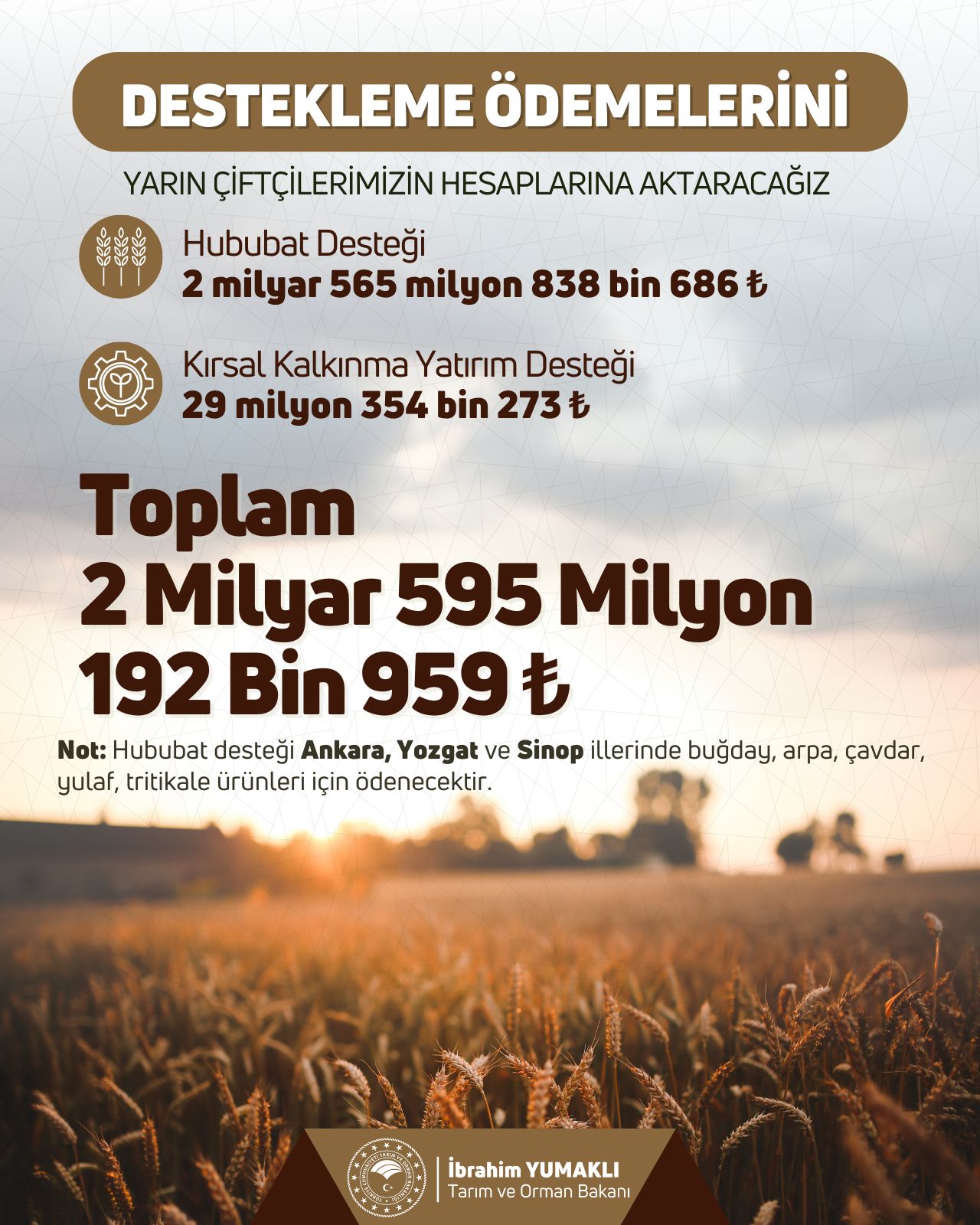 Tarım ve Orman Bakanı İbrahim Yumaklı, 2 milyar 595 milyon 192 bin liralık destekleme ödemesinin, çiftçilerin hesaplarına aktarıldığını bildirdi.