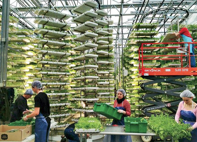 Çiftlikte yeşillikler, hidroponik olarak yüksekliği 7.5 m bulan dikey raflarda bilgisayar kontrollü özel LED ışıkların altında yetiştirilerek haftada 2 kez ürün elde ediliyor.
