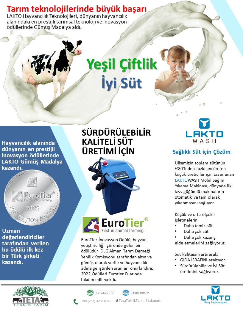 LAKTO Hayvancılık Teknolojileri, hayvancılık alanında dünyanın en prestijli inovasyon ödüllerinde Gümüş Madalya kazandı. LAKTO önemli bir başarıya imza atarak Eurotier ödüllerden birini kazanan ilk Türk firma oldu. 2022 yılında LAKTO'nun LAKTOWASH ürününün Gümüş Madalya kazananlarından olduğu EuroTier İnovasyon Ödülü, dünya çapında uzman değerlendiricilerden oluşan DLG Alman Tarım Derneği Yenilik Komisyonu tarafından altın ve gümüş olarak verilir ve hayvan yetiştiriciliğinin önde gelen ödülüdür.