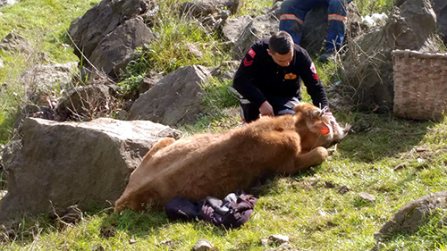 Zonguldak'ın Ereğli ilçesinde, otlanırken kayalıklara yuvarlanan dana, itfaiye ekibi tarafından kurtarılıp, sedyeyle kamyona taşındı.