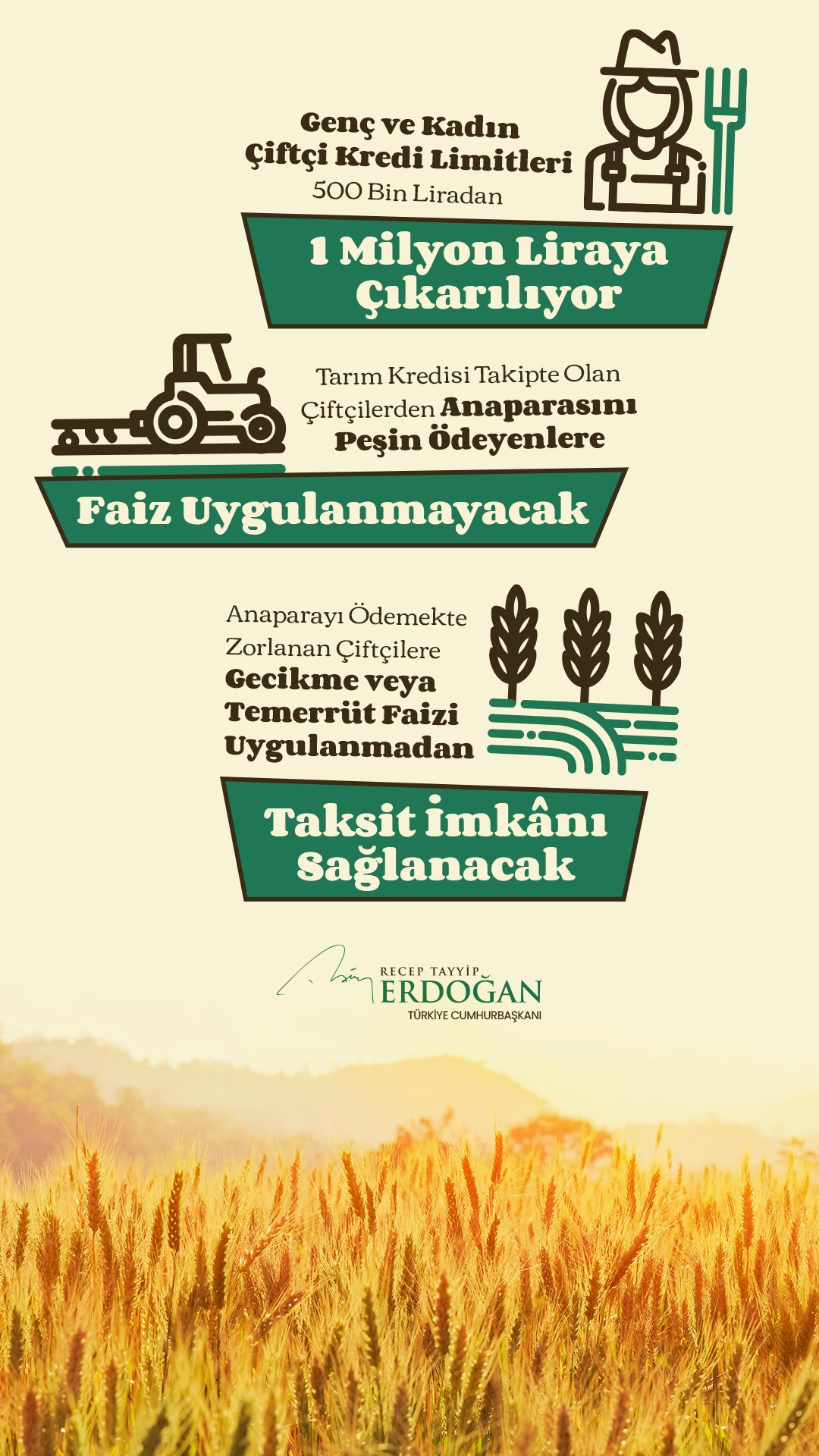 İlk olarak Çiftçi Destek Kredisini uygulamaya geçireceğimizin müjdesiyle başlıyoruz. Çiftçilerimiz hasat dönemine kadar yapacakları her türlü harcama için kullanabilecektir. Gelir elde edemedikleri ihtiyaçlarını rahatla karşılayabilecektir. Kişi başına 250 bin liraya kadar verilecek kredinin yıllık faiz oranı yüzde 9,75 ve vade süresi 36 aya kadar olacaktır.