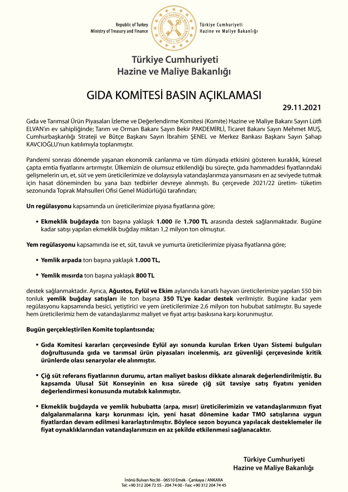 "Gida Komitesi kararları çerçevesinde Eylül ayı sonunda kurulan Erken Uyarı Sistemi bulguları doğrultusunda gida ve tarımsal ürün piyasaları incelenmiş, arz güvenliği çerçevesinde kritik ürünlerde olası senaryolar ele alınmıştır. Çiğ süt referans fiyatlarının durumu, artan maliyet baskısı dikkate alınarak değerlendirilmiştir. Bu kapsamda Ulusal Süt Konseyinin en kısa sürede çiğ süt tavsiye satış fiyatını yeniden değerlendirmesi konusunda mutabık kalınmıştır. Ekmeklik buğdayda ve yemlik hububatta (arpa, mısır) üreticilerimizin ve vatandaşlarımızın fiyat dalgalanmalarına karşı korunması için, yeni hasat dönemine kadar TMO satışlarına uygun fiyatlardan devam edilmesi kararlaştırılmıştır. Böylece sezon boyunca yapılacak desteklemeler ile fiyat oynaklıklarından vatandaşlarımızın en az şekilde etkilenmesi sağlanacaktır."
