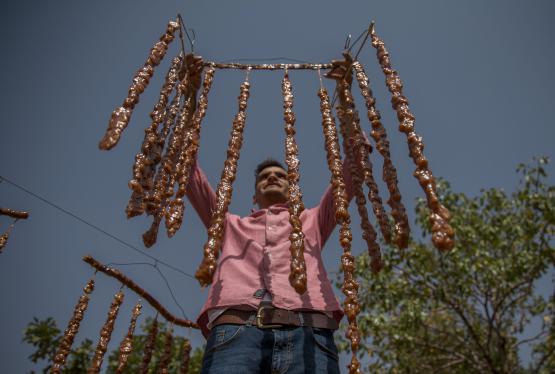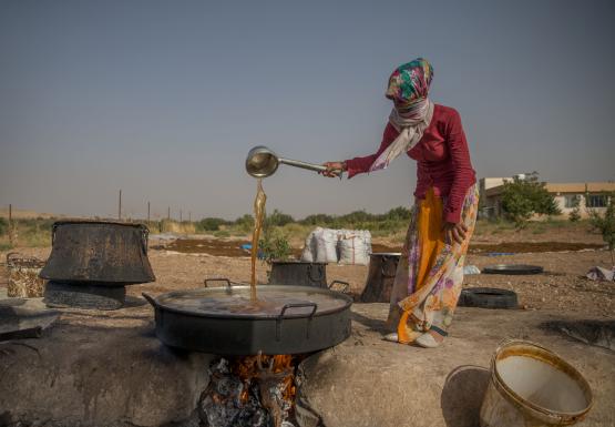 "Sabah topladığımız üzümleri burada sıkıp suyunu çıkarıyoruz. Kaynattıktan sonra içine un ve mısır nişastası katarak tepsilere döküyoruz. Donduktan sonra bıçaklarla kesiyoruz. Günlerce güneşte beklettikten sonra topluyoruz. Buna da kesme adı verilir. Her sene kış için yoğun bir hazırlığımız olur. Bizim işlerimiz sonbaharda başlıyor. Yağmur yağmaması için dua ediyoruz. Yağmur yağdığı zaman bütün emeğimiz heba oluyor. Onun için elimizi çubuk tutuyoruz. İnşallah yağmurlar geç başlar."