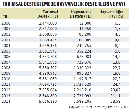 Tarım sektörüne verilen desteklerin önemli bir bölümünü hayvancılık destekleri oluşturuyor. Yem bitkilerinin üretiminden belgeli, damızlık kullanımının teşvik edilmesine kadar geniş bir yelpazede hayvancılığa destek veriliyor. Son yıllarda hayvancılık desteklerinin tarım destekleri içerisindeki payı ciddi oranda artış gösterdi. 2000 yılında hayvancılık desteklerinin tarımsal desteklemedeki payı binde 5 düzeyinde iken 2014’te bu oran yüzde 28.5’a ulaştı.