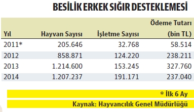 Kırmızı Et Stratejisi’nde besiciliğe doğrudan verilen desteklerle ilgili şu değerlendirmeye yer veriliyor: “2010 yılında sığır eti karkas fiyatlarında yaşanan yükselişi önlemek amacıyla alınan kırmızı et ithalat kararı sonrasında üreticilerde oluşacak tedirginliğin giderilmesi ve ithalat karşısında korunması amacıyla 2011 yılında ilk 6 aylık döneminde kesilen erkek sığırlar için destekleme verilmeye başlanmıştır. Bu destekleme 2012, 2013 ve 2014 yıllarında, yılın tamamını kapsayacak şekilde genişletilmiştir. Uygulamanın ilk 3 yılında kesilen erkek sığır başına 200 lira olarak uygulanmıştır. Üreticiler arasında desteklemeye olan farkındalığın zaman içerisinde artması ile 2012, 2013 ve 2014 yıllarında başvuru sayısı ve destekleme miktarları artmıştır. Destekleme sonuçları,ülkemizde büyükbaş hayvan besiciliğinin yapısı hakkında önemli göstergeler sunmaktadır. İç Anadolu, Ege ve Marmara Bölgesi destekten yüzde 70 pay almıştır. İklim ve coğrafi koşulları besiye uygun olması ve besilik yem materyaline ulaşımın daha ucuz ve kolay olması nedeniyle bu bölgelerde entansif besicilik yoğun olarak yapılmaktadır. Bu nedenle et entegre tesisleri de bu bölgelerde yoğunlaşmıştır ve pazara ulaşım daha kolaydır.