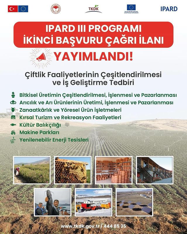 Tarım ve Kırsal Kalkınmayı Destekleme Kurumu (TKDK) tarafından uygulanan IPARD III Programı 2. Başvuru Çağrı İlanı yayımlandı. Tarım ve Orman Bakanı İbrahim Yumaklı, Türkiye-Avrupa Birliği (AB) tarafından ortaklaşa finanse edilen IPARD I ve IPARD II Programları kapsamında bugüne kadar 25 bin 489 adet tesis ve proje gerçekleştirildiğini ve girişimcilere toplam 45,5 milyar TL hibe desteği verildiğini hatırlattı.