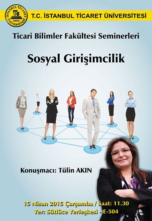 Ticari Bilimler Fakültesi Seminerleriinde Sosyal Girişimcilik konusunda deneyimlerini anlatacak olan Tarimsalpazarlama Kurucusu ve CEO'su başarılı girişimci Tülin AKIN, 15 Nisan 2015, 11.30 tarih ve saatinde tüm deneyimlerini seminerlere katılan herkesle paylaşacak.