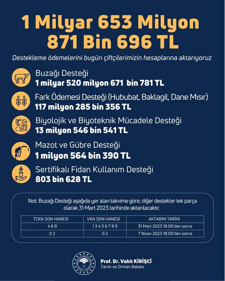 Yağlı ay çiçeğinde ise mazot ve gübre desteğini dekar başına 37 liradan yüzde 195 artışla 109 TL, fark ödemesinde ise kilogramda 50 kuruştan 70 kuruş seviyesine yükseltiyoruz. Ayçiçeğindeki toplam destek dekarda 297 lirayı, kilogramda 1 lira 11 kuruşu buluyor. Bu yıl 2 milyon 75 bin ton kütlü pamuk ve 550 bin ton ayçiçeği üretimiyle tüm zamanların rekorunu kırılmasını bekliyoruz. Sen üret yeterli anlayışıyla çiftçilerimizi desteklemeye devam edeceğiz. Açıkladığımız destekleme fiyatlarının üreticilerimize hayırlı olmasını diliyoruz"