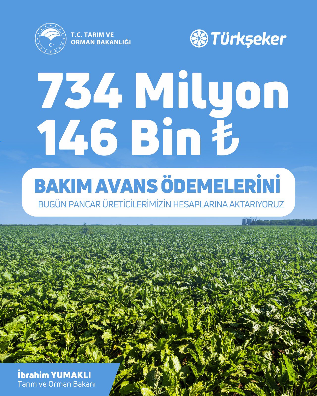 Bu kapsamında 734 milyon 146 bin TL'lik pancar bakım avans ödemesi üreticilerin hesaplarına aktarılacağı açıklandı.