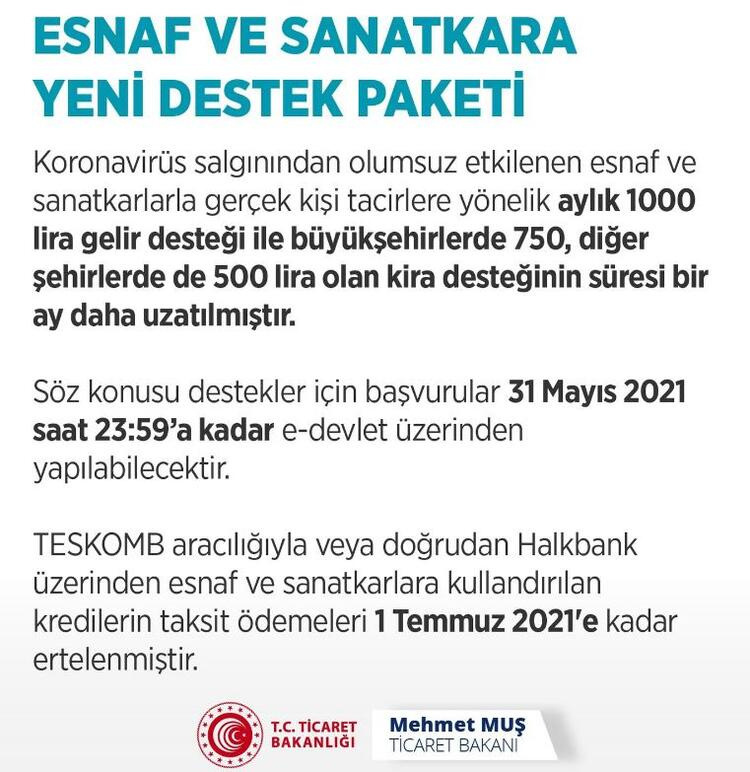 Şartları taşıyan mikro veya küçük işletmeler, 3 Mayıs Pazartesi'den itibaren e-Devlet üzerinden KOSGEB aracılığıyla başvurularını yapabilecekler. TESKOMB ve Halkbank aracılığıyla esnafa kullandırılan kredilerin taksit ödemeleri de 1 Temmuz 2021'e kadar erteleniyor.