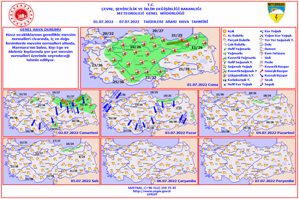 Meteoroloji Genel Müdürlüğü'nün aktardığı bilgilere göre, bir süredir yurdu etkisi altına alarak sel ve taşkınlara neden olan yağışlı hava, bugün de ülkenin kuzey, iç ve doğu bölgelerinde etkili olmaya devam edecek. Yağışların; Çankırı çevreleri ile Ankara'nın kuzey, Giresun, Trabzon ve Rize'nin iç kesimlerinde yerel olarak kuvvetli olması bekleniyor.