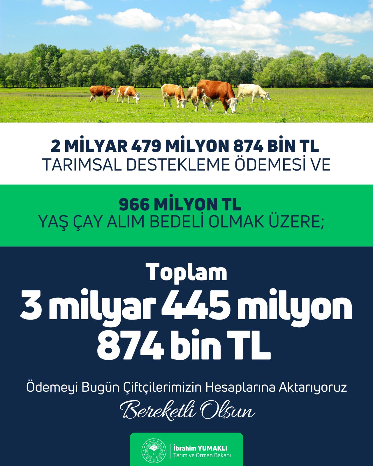 Tarım ve Orman Bakanı İBrahim Yumaklı, 2 milyar 479 milyon TL tarımsal destekleme ödemesi ve 966 milyon TL yaş çay alım bedeli olmak üzere; toplam 3 milyar 445 milyon 874 bin TL ödemeyi bugün çiftçilerimizin hesaplarına aktarılacağını açıkladı.