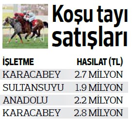 BU yıl satışını gerçekleştirdiği 176 koşu tayından toplam 9.6 milyon lira hasılat elde eden Tarım İşletmeleri Genel Müdürlüğü, tay başına 55 bin lira kazandı. İstanbul Veliefendi Hipodromu'nda yapılan ilk elit tay satışında ise Habilden adlı tay 300 bin liralık satış fiyatıyla dikkat çekti.<br />