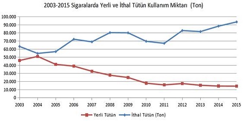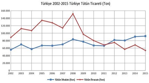 Türkiye'de 2015 yılında 53 bin 857 ton tütün 382,8 milyon dolar karşılığı ihraç edilmiş. Buna karşılık 2002 yılında 55 bin 800 ton olan tütün ithalatı, 2015 yılında rekor kırarak yaklaşık 92 bin 266 tona ulaşmış. Söz konusu ithalatın bedeli ise 528,4 milyon dolara denk geliyor.