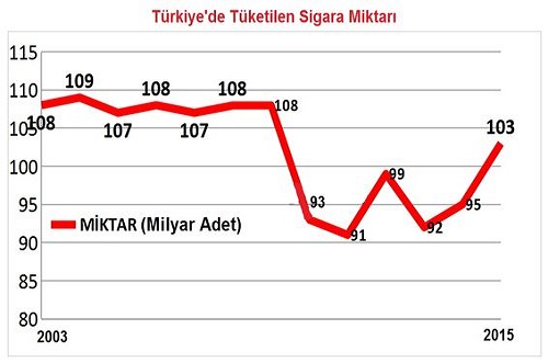 Son 15 yılda ilk defa 2008-2011 yılları arasında yüzde 15'lik bir düşüş gösteren sigara tüketiminin 100 milyar adedin altına indiğine dikkat çekilen raporda, tüketimin 2012 yılında 8 milyar adetlik artışla tekrar 100 milyar sınırına dayandığı ve 2015 yılı itibarıyla 103,2 milyar adede yükseldiğine dikkat çekiliyor.