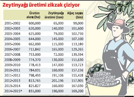 3573 sayılı Zeytincilik Kanunu, zeytinlik sahalarına 3 kilometre mesafeye kadar zeytinyağı fabrikası hariç, kimyevi atık bırakan, toz ve duman çıkaran tesis yapılmasını yasaklıyor. Yasa, bu alanlarda küçük ölçekli tarımsal sanayi işletmeleri yapımı konusunu ise Gıda Tarım ve Hayvancılık Bakanlığı’nın iznine bağlanıyor. Ancak yürürlükteki yasanın bağlayıcı hükümlerine rağmen, sanayi tesisleri yapımı amacıyla zeytinliklerin kesilmesinin önüne geçilemiyor. Soma’da kesilen 6 bin zeytin ağacı yanı sıra hemen her dönemde, daha çok sayıda ağacın kesildiği biliniyor. Bütün bu olumsuz gelişmelere rağmen, Türkiye’de zeytin tarımı ve bağlı ürün üretiminde ciddi artış yaşanıyor. 2000 yılında ülkemizde 600 bin hektar alanda zeytincilikle uğraşılırken, 2014-2015 üretim dönemi itibariyle zeytin alanları 831 bin hektara yükseldi. Aynı dönemde ağaç sayısındaki artış çok daha yüksek oldu ve 99 bin adetten 169 bin 2300’e çıktı. 2000 yılında 600 bin ton civarında olan zeytin üretimi, 2014’te 1 milyon 778 bin tona yükselmesi bekleniyor. Başka bir ifade ile 14 yıllık dönemde zeytin üretimi yaklaşık 3 katına çıktı. Aynı dönemde zeytinyağı üretimi ise 65 bin tondan 190 bin tona yükseldi.